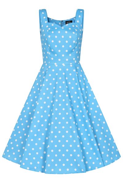 Playful, elegant, and full of retro charm, The Marlene Polka Dot Swing Dress brings a fresh twist to a beloved vintage classic. Designed in a cheerful sky-blue shade adorned with crisp white polka dots, this timeless print pairs beautifully with the refined swing silhouette, creating a look that is both flattering and full of personality. The sleeveless and sweetheart neckline bodice offers clean, graceful lines while shaping the bust and waist for a beautifully feminine fit. From there, the dress flows into a full 1950s-style swing skirt, giving you that signature swish and movement ideal for sunny days, weekend outings, and afternoons styled with effortless vintage flair. Light, breezy, and irresistibly pretty, The Marlene Polka Dot Swing Dress is made to bring joy to every wardrobe.