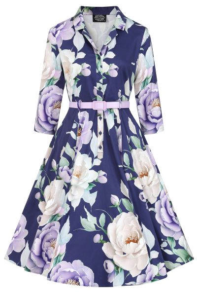 Step into effortless elegance with our new May Floral Swing Dress, designed to capture a perfect blend of vintage charm and modern style. The dress features a classic lapel collar and chic ¾ length sleeves, adding a touch of tailored sophistication. A row of front buttons runs along the button placket, enhancing its timeless appeal. Crafted on a dark royal base, this dress blooms with vibrant purple and cream florals, soft green leaves, and artistic, painterly florals for a lively array of colours. The waist is adorned with a purple belt and convenient belt loops. Thoughtfully designed with hidden side-seam pockets, this dress is as functional as it is fashionable. Perfect for your autumn walks, weekend brunches, or special occasions, this dress brings floral flair to any wardrobe.