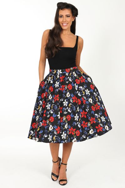 Welcoming our brand new Maria Floral Swing Skirt. Made in our comfortable cotton blend fabric, this style has been designed to wear with ease and comfort. The waistband is cinching in the waist to allow the skirt to have a fabulous full swing, showing off the beautiful floral print. This fabulous floral is made up of bursts of reds, blues, whites and yellows, all laid out on a dark black base to let the colours pop. We haven’t forgotten about the incredibly handy hidden side pockets, there to hold your necessities. Why not pair this style with one of our separate tops to complete the outfit!