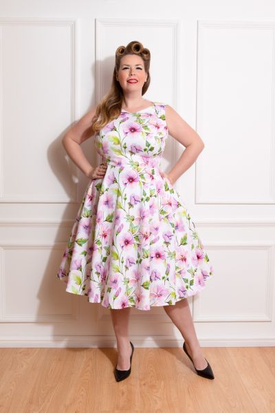 Move with a spring in your step this season, in our Naomi Floral Swing Dress. This print is in full bloom with its purple, yellow and green tones scattered all over the spring white base. The classic 1950s shape of this style with its fitted bodice and full swing skirt, works perfectly in balance with the detail on the neckline. Designed with a boat neckline, this style also features a sweet lapel detail which is topped off with delicate buttons to catch the eye. Perfect for a summer’s garden party or an evening event, this style will take you easily from day to night. Just style with your favourite flats or heels and you’re ready!