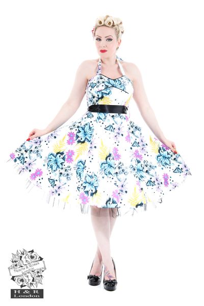 Feisty and fashionable in our Neon Floral Halter Dress!  Featuring a white background with H&R's beautiful multi-coloured flower and butterfly pattern.  The Neon Floral Halter Dress has halter straps on a sweetheart neckline with black piping.  Black satin belt ties at waist and there is pretty black crinoline peeking out from the hemline.