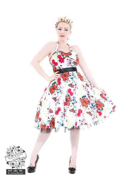 Feisty and fashionable in our Neon Floral Halter Dress!  Featuring a white background with H&R's beautiful multi-coloured flower and butterfly pattern.  The Neon Floral Halter Dress has halter straps on a sweetheart neckline with black piping.  Black sating belt ties at waist and there is pretty black crinoline peeking out from the hemline.