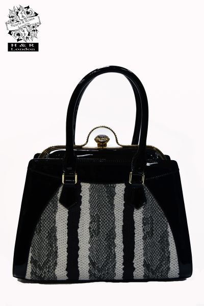 Hearts & Roses London’s Pandora tote bag’s compact shape is designed for everyday chic. The front have been crafted white and black snake effect print with clip fastening and a detachable shoulder strap. This versatile bag is finished in luxurious gloss PU leather with gold toned hardware and has a practical internal zip compartment for all your essentials. Stylish enough to be worn for day or night.