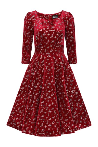 Step into the spotlight with our brand-new Paris Sparkle Swing Dress. This red velvet winter party dress is adorned with sparkly details that add a touch of glamour to your winter wardrobe. The dress boasts a flattering sweetheart neckline and a charming front bow, perfect for any festive occasion. The gathered ¾ length sleeves and under-bust detailing enhance its elegant silhouette. A shaped waistband beautifully defines the waist, while concealed side seam pockets add a practical touch without compromising style. Completing the look is a concealed back zip, ensuring a seamless finish. Looking for the perfect dress to wear to your festive parties? Look no further because this style will have you standing out from the crowd with its enchanting festive print.