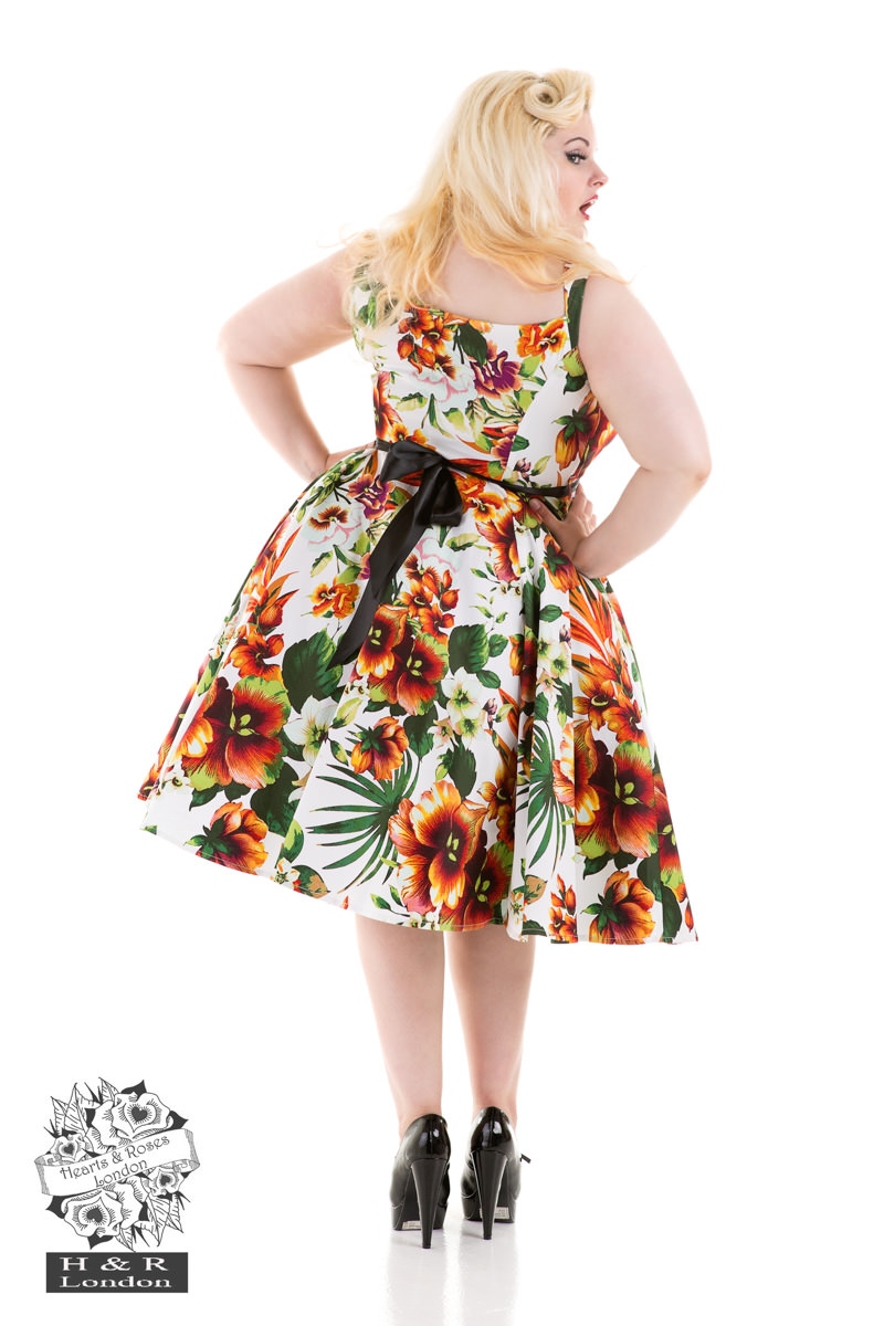 Feel pretty & royal in our summer bestseller, retro style swing dress, The Princess Lily Dress in Red. This design features a captivating print of beautiful pink blooms with Dark Green leaves, enhancing the vivid shades of Pink, Fuchsia, and Dark Red and Green Floral. The beautiful design has a charming Tropical feel. To add to the style, we crafted a Black satin sash which ties at the waist, and a full swing skirt design to give you that Retro Vintage look. Perfect for all kinds of occasions.