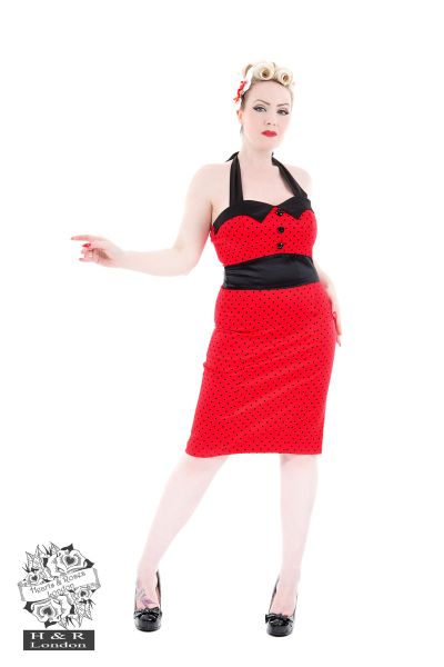 Classic Vintage Red Black Polka Dot 40s Pencil Dress is an elegant style for your Spring/Summer wardrobe, while also complementing a style for work or a special occasion. The design features Black Polka Dots on a beautiful stretchy Red cotton material. To complement the 40's style, this style is a halter dress with a very flattering pencil cut. Includes a Black satin halter tie and a Black Satin tie belt for a better fitting.
