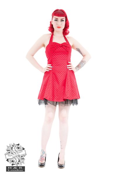 Pretty as a present in our beautiful Red Black Polka Dot Dress!  Our classy little number has a sweetheart neckline with halter straps that tie in back of the neck.  Features a side zipper and black crinoline peeking out from the bottom.