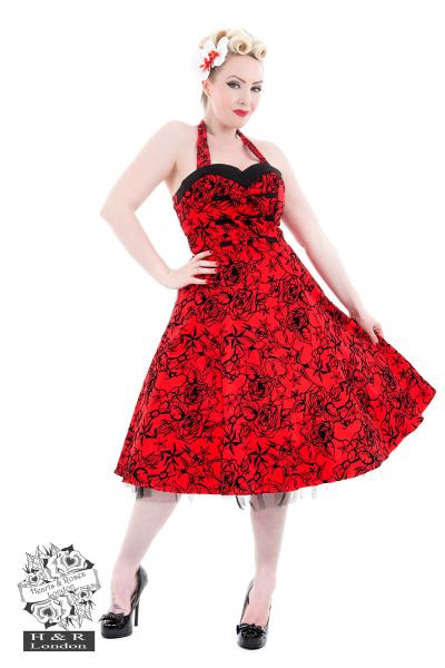Taffeta Flocked Halter Dress from H&R London is a cute halter-style dress made out of medium weight cotton with straps that tie at the back of the neck.     Black piping on the bust line creates a flattering sweetheart shape, and the print of this dress has barbed wire roses, anchors, stars, and bows.   The print is on raised felt to create an attractive and unique texture to the dress.    Bodice of the dress has three matching barb wire print bows set on black detailing.   Dress has built-in cotton lined black petticoat for increased volume and dress hits just below the knee.    Dress zips up the side.    Available in Black and Purple.