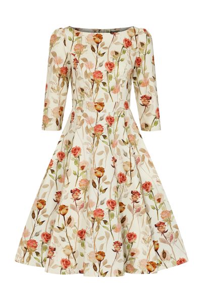 Step into effortless elegance with our brand-new chic Robyn Floral Swing Dress, designed to captivate and charm. The all over floral print is made up of romantic roses laid out in a delicate fashion. This style features a sophisticated boat neckline, which gracefully frames your shoulders, adding a touch of refinement to your look. The gathered ¾ length sleeves provide both style and comfort, making it perfect for various occasions. A defined waistband accentuates your figure, while the concealed side seam pockets offer practicality without compromising on style. The concealed back zip ensures a sleek and smooth silhouette, making this floral dress a versatile and timeless addition to your wardrobe.