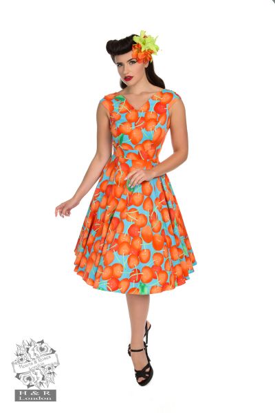 A new design in an all-time favourite and popular print! Hearts & Roses present another great seller, a classic in a new stylish design. The Royal Ann Cherry dress is embellished with cherries all over in three different shades (black, white and light blue). The contrasting colours add a certain vibrance, special to this piece, befitting of any vintage lover. The dress consists of a cotton blended fabric, a simple v-neckline, with the fitted bodice flowing into a gorgeous full effect swing skirt. Its cap sleeves and bodice feature in just one fabric cut which concludes to give a perfect style and fit.