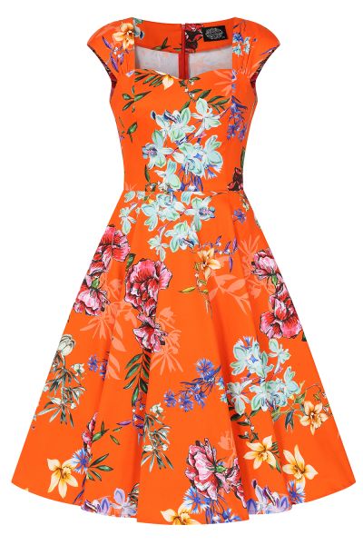 Radiate sunshine and confidence in our Sunrise Swing Dress, a stunning blend of vivid colour and classic femininity. Set against a striking sunset orange backdrop, this dress blooms with vibrant orchids and painterly florals in shades of lilac, blue, coral, and gold, creating a captivating print that feels both tropical and timeless. The beautifully structured bodice features an elegant wide neckline with a subtle sweetheart shape, framed by delicate cap sleeves for a flattering and graceful look. Designed to enhance the silhouette, the fitted waist flows into a classic full swing skirt, offering that iconic Hearts & Roses London twirl with every step. Crafted from soft, breathable fabric, this dress is perfect for warm days, special occasions, and anywhere you want to stand out with effortless charm.