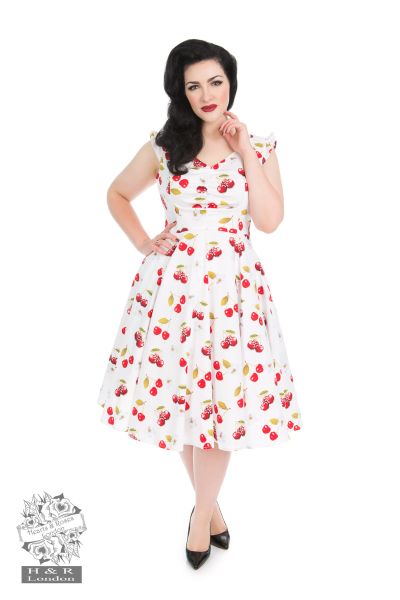H&R London's Sweet Cherries Swing dress will be your go-to pick for all the summer soirees! The dress is made out of wondrously soft and stretchy cotton. Two different tones of cherries with sage green leaves and light blue flowers are set on a white background. The dress has a slight ruffle on the straps, with a gathered bust line and flattering princess seams.
