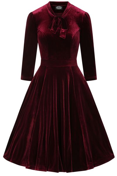 Step into timeless elegance with our new burgundy Sylvie Velvet Swing Dress, inspired by the glamour of the 1950s. Crafted from sumptuously soft velvet, this dress features a flattering V-neckline accented by a charming self-fabric bow that ties at the front. The gathered shoulders and 3/4 length sleeves add a touch of vintage sophistication, while the defined waistband cinches the silhouette for a feminine shape. Designed with hidden side seam pockets for a practical touch, the full swing skirt moves gracefully with every step. Perfect for special occasions or simply embracing classic style with a modern twist.