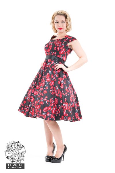 50’S rockabilly style Taffeta Red Rose Day Dress by H&R is an all year round style which complements a summer wardrobe style or an autumn winter style. The print consists of gorgeous red roses on a black stretchy cotton material. To add a sleek edge, a black satin sash is added which nips in at the waist. The cut of the bodice is fitted which flares into a swing skirt, giving you a sophisticated retro vintage look.