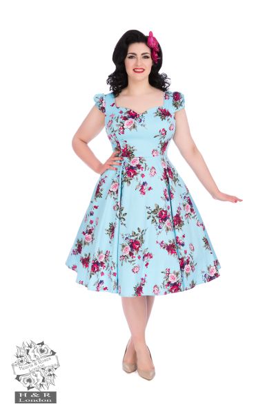 The Royal Ballet is truly resplendent. Flaunt your inner pinup with this beautiful tea-length dress in a wondrous sky blue. The classic sweetheart neckline is demure yet flirty and the cap sleeves keep you covered, yet adorably adorn the shoulders. The beautiful rose bouquets through feature classic colours of lilac, pink and magenta roses with sage green leaves.