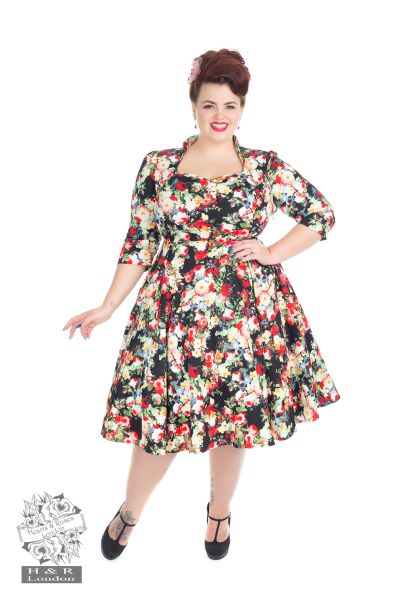 Frolic over the rivers and through the woods in the beautiful Thorny Rose Swing Dress, new From H&R London!   Keep those chilled arms warm in our newest long sleeved frock.   The dress is made out of beautiful, soft stretchy cotton with a magnificent woodland red and green rose pattern, set on a black background.    This dress features a Queen Anne neckline and comfortable 3/4 length sleeves.  Dress is princess-seamed, with an empire waist and a full swing skirt.  Dress hits just below the knee, and zips up the side.