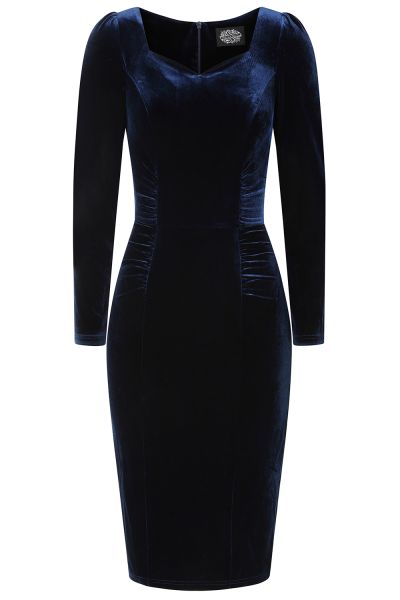 Embrace vintage glamour in this figure-flattering retro-inspired royal blue Tia Velvet Wiggle Dress. Designed with a romantic sweetheart neckline and long sleeves featuring softly gathered shoulder seams, this dress offers a touch of 1950s elegance. Subtle gathering along the front enhances the silhouette, while a hidden back zip ensures a sleek, seamless fit. Perfect for adding classic sophistication to your day or evening wardrobe.