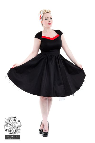 The perfect little dress made a bit daring by a flash of "V"!   The Vivian Dress from H&R London is both simple and sweet. Made out of a soft, stretchy cotton, this cap sleeve swing dress has a soft v neckline with a contrasting band of red or black. The bold red and black v draws the eye upward to your pretty face, while the built-in black petticoat gets those legs some attention! Dress has a full swing skirt that flares at the waist.