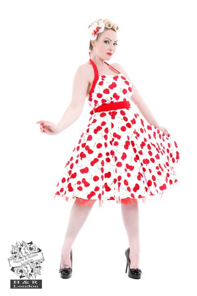 Ready for Summer are we? Enhance your everyday Summer look in our White Bombshell Cherry Swing Dress. Our striking white cotton rockabilly dress, featuring a printed design of cherries on a white background is a summer style that will have compliments coming your way. With a sweetheart bust line & a halter neck tie, we added a contrasting red cotton belt which nips in at the waist to give the dress a vibrant look. Fully lined skirt in soft cotton with a red netted trim, giving you plenty of room to add a petticoat.